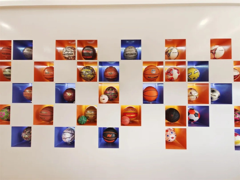 Meidong Sports의 제품 쇼룸에는 다양한 스타일과 밝은 색상의 수십 개의 농구, 축구 및 배구 제품이 있습니다.